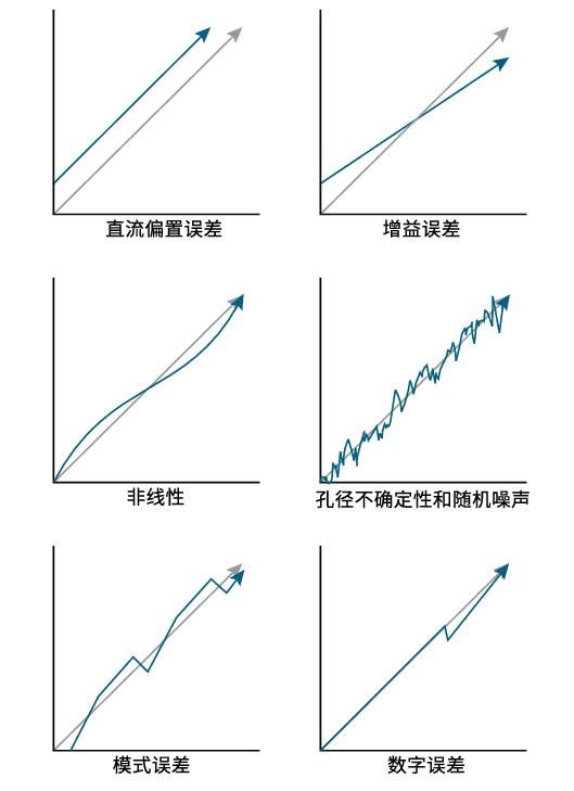 - 常见模拟相关误差:直流偏置(含交流偏置 / 模式误差)、增益误差(直流和交流)、非线性(模拟部分)、非单调性(数字部分)、相位误差、随机噪声等,这些误差可能出现在从模拟信号输入到数字化输出的任意波形捕获环节,属于放大器或模拟网络中的经典误差。