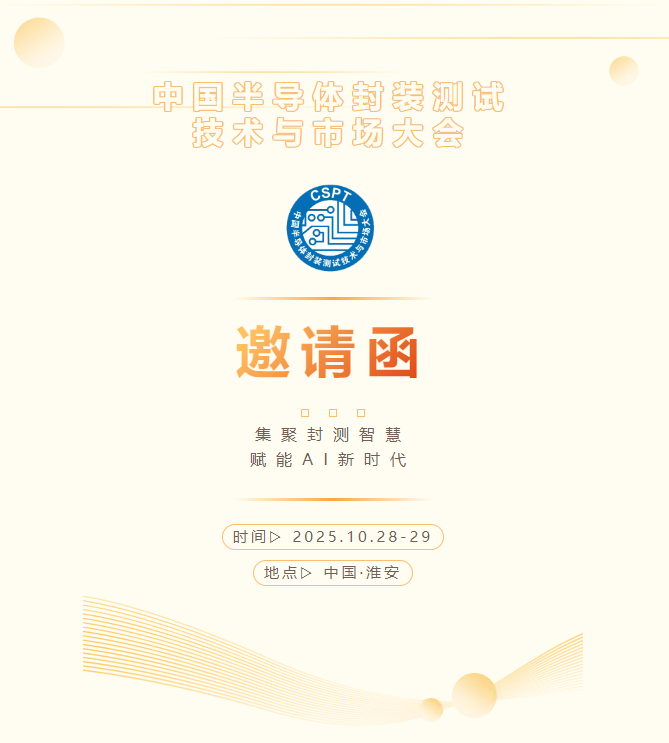 中国半导体封装测试技术与市场大会(CSPT)将于2025年10月28–29日在江苏省淮安市精彩亮相。作为国内唯一覆盖封装与测试全产业链的专业平台,CSPT迄今已在无锡、天水、江阴、南通等地成功举办20余届,持续推动先进封装量产化、可靠性测试体系完善以及上下游产业协同。本届移师淮安,将在AI与算力需求爆发的窗口期,面向2.5D/3D、HBM、Chiplet与异构集成等前沿方向,全面呈现“封装即性能”的产业范式转变。2025,CSPT与您相约淮安,共同“集聚封测智慧,赋能 AI 新时代”!