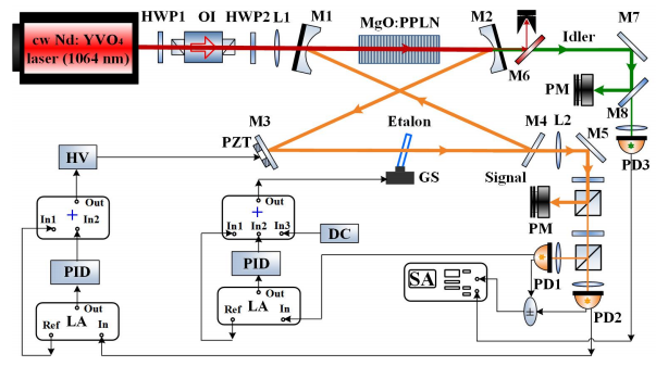 利用SRO获得连续宽调谐的红外激光并对信号光和闲置光强度噪声进行优化的实验装置如图2所示。泵浦光源为实验室自制的1.06μm的Nd:YVO4激光器。首先经过半波片(HWP1)和光隔离器(OI)以防止反射光影响激光器,然后通过HWP2来控制泵浦光进入SRO腔的偏振方向。实验所用的SRO设计为对称的四镜环形结构,SRO腔的具体参数跟第三章相同。为了获得无跳模运转的信号光,利用尺寸为2mm(T)×5mm(W)×1mm(L)的铌酸锂电光晶体作为标准具,并将标准具插入到M3和M4之间,利用标准具的选模作用来实现信号光的单纵模运转。M4输出的信号光经M5反射后,通过HWP和PBS后大部分信号光注入到相干功率计中来测量其输出功率,剩余部分的信号光注入到自零拍探测系统用来测量和分析信号光的强度噪声,该探测系统由HWP、PBS和光电探测器PD1和PD2组成。进入PD1和PD2的信号光转化为电流后输入加减法器,并通过频谱分析仪(SA)测量和、差信号,和与差分别代表信号光的强度噪声和对应的SNL。PD2输出的直流信号进入LA解调后获得误差信号,并将误差信号输入到PID进行处理,然后将PID输出的控制信号经过高压功率放大器(HV)施加到PZT上,以此来实现腔长的控制。