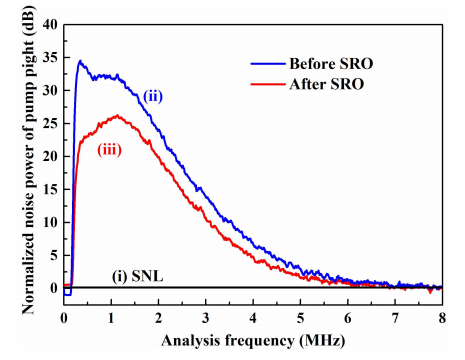 图2:泵浦激光在SRO腔前和透过SRO腔后的强度噪声谱