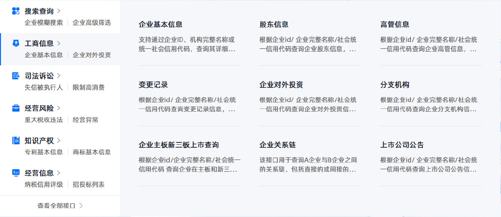 2、企业工商信息类API接口:企业基本信息、股东信息、高管信息、变更记录、对外投资、分支机构、企业关系链、企业年报、企业要素核验、税务发票抬头信息、企业公开联系方式、企业上市信息...等;