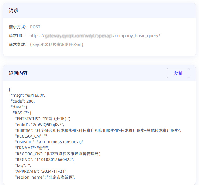 所谓企业信息查询API接口,就是用户通过API接口的方式来获取企业数据信息,例如:用户通过向服务器发送指定请求,来获取企业的工商、司法、经营、风险、信用、专利、商标、招招聘、投标、投融资等数据信息,可以把企业信息查询API接口理解为调用获取企业各类数据信息接口的统称。