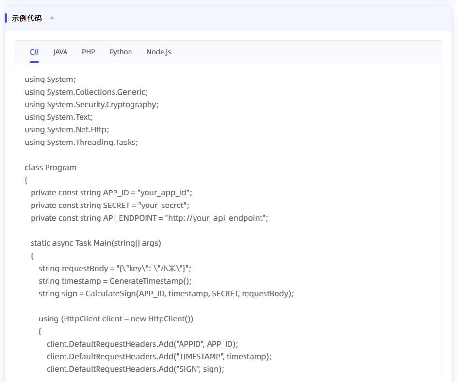 String sign = calculateSign(APP_ID, timestamp, SECRET, requestBody);