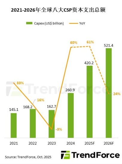 TrendForce集邦咨询表示,2026年在GB/VR等AI机柜方案持续放量下,八大CSP的总资本支出有望再创新高,年增达24%,来到5,200亿美元以上。除此之外,支出结构已从能直接创造收益的设备,转向Server、GPU等资产,意味着巩固中长期竞争力与市占率优先于改善短期获利。