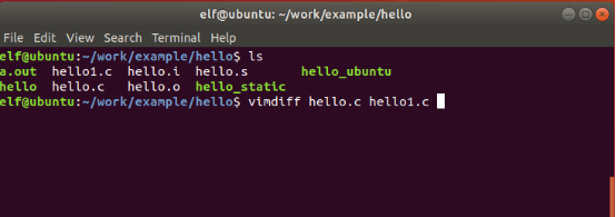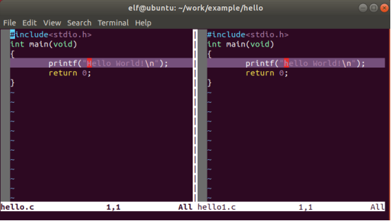 | elf@ubuntu:~/work/example/hello$ vimdiff hello.c hello1.c |