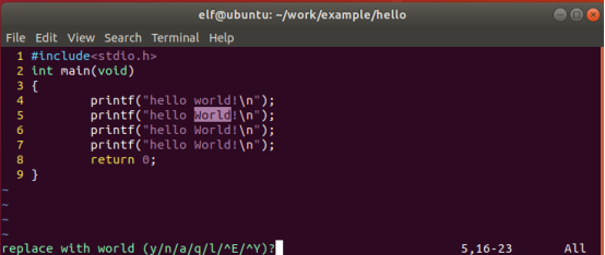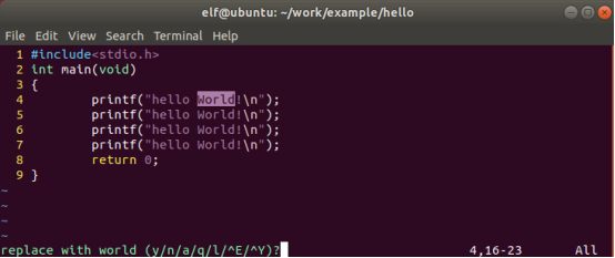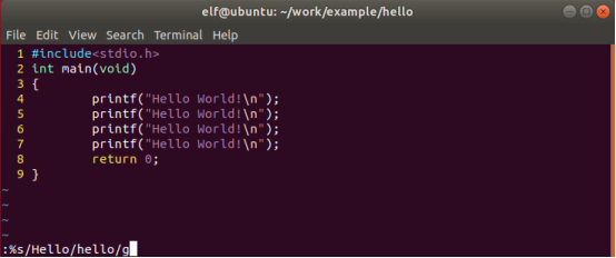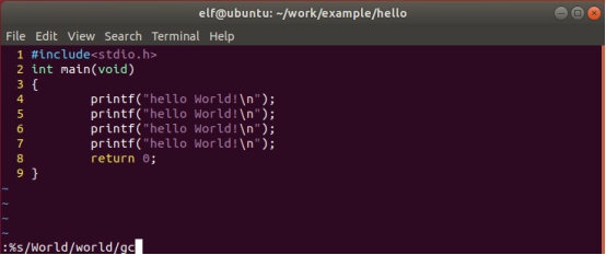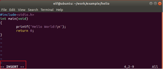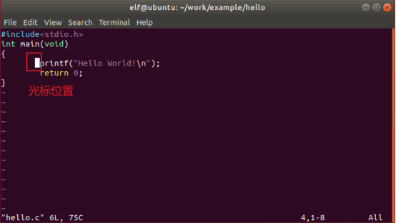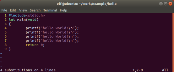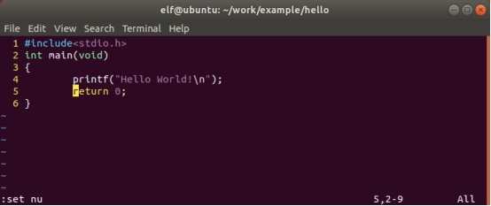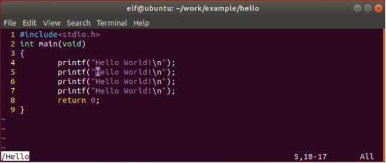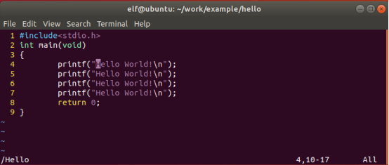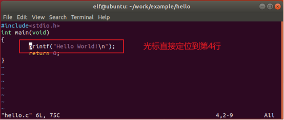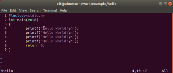 | elf@ubuntu:~/work/example/hello$?vim hello.c +4 |