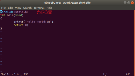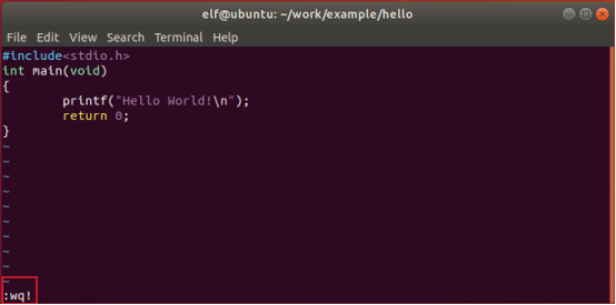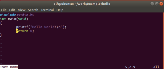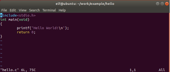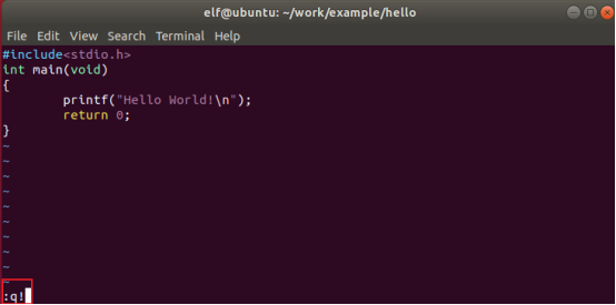 | elf@ubuntu:~/work/example/hello$?vim hello.c |
