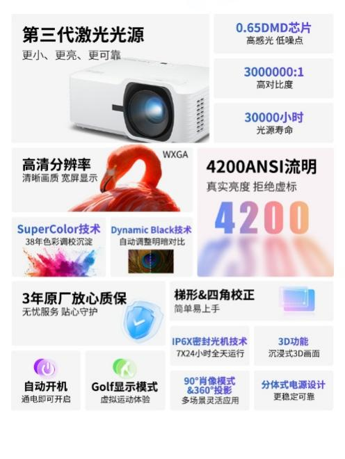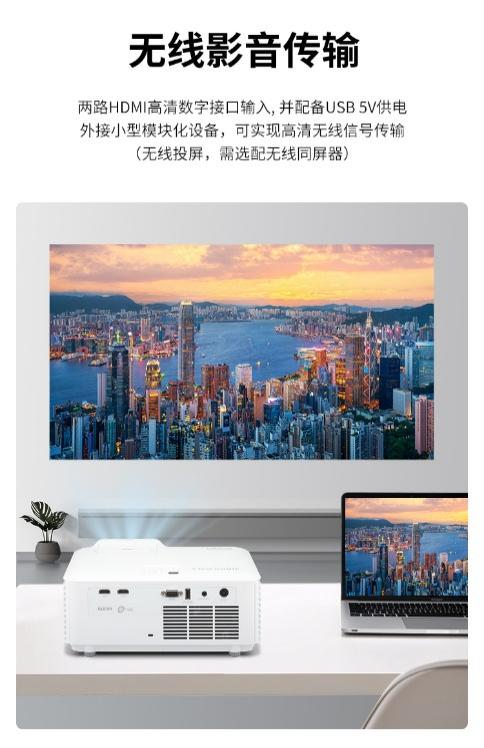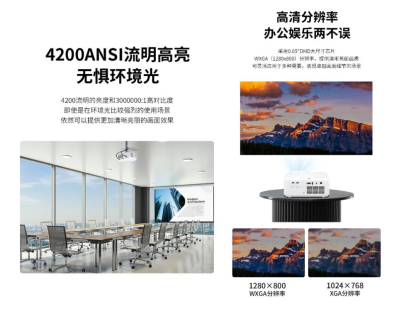 LSD400W搭载激光光源,亮度高达4200 ANSI流明,对比度高达3000000:1,结合WXGA(1280×800)分辨率,即使在强光环境下也能投射出清晰锐利的画面。无论是会议室的白天演示,还是教室中的多媒体教学,LSD400W都能确保内容清晰可见,文字锐利,图像细节丰富。