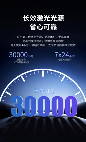 LSD400W采用第三代激光光源技术,模块体积更小,散热效率更高,具备更强的稳定性与可靠性。相比传统灯泡投影机,激光光源不仅亮度更高,而且在节能模式下可实现长达30000小时的使用寿命,免除更换光源的烦恼,显著降低后期维护成本与人力投入。