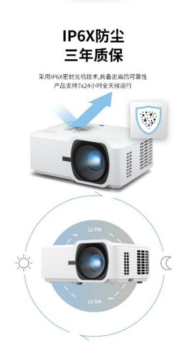 该产品还采用IP6X等级密封光机设计,有效防止灰尘侵入,保障光学系统长期稳定运行。支持7×24小时不间断工作,即使在高频使用的教育机构或企业会议室中,也能保持画质如初,确保关键演示任务顺利完成。无论是日常教学,还是会议演示,LSD400W都能提供持久可靠的视觉输出。