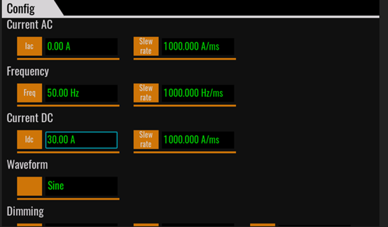 在Current Source下,选择AC+DC模式,将AC值设置为0,DC值设置为30A,可以实现DC恒流30A的功能