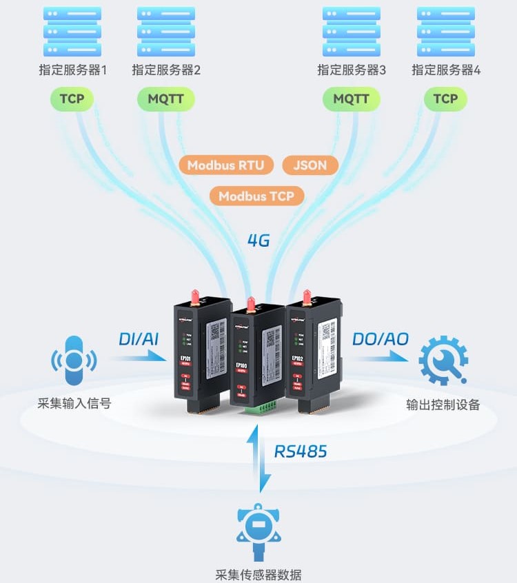 EP101:RS485×1 + DI×4 + DO×4,可用于带开关控制的场景;