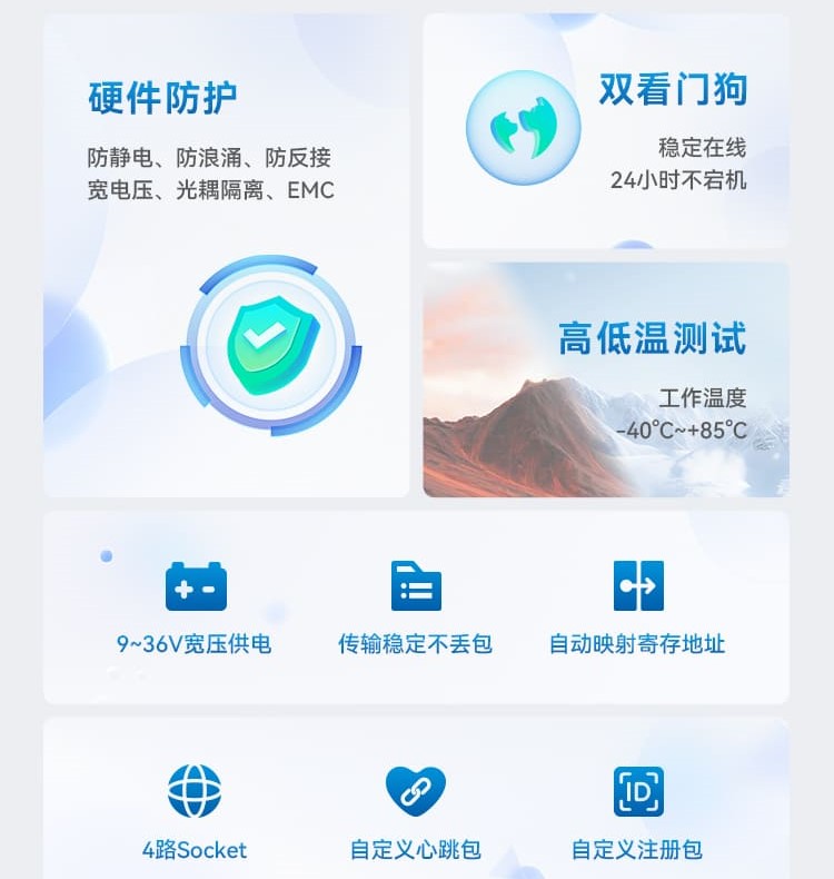 工业环境的不可预期性很高,因此EP100在硬件上做了不少防护:防静电、防浪涌、防反接设计,还支持**-40℃~85℃宽温运行和9-36V宽压供电**。软硬件“双看门狗”机制则保证设备稳定在线,确保数据传输不掉链子。