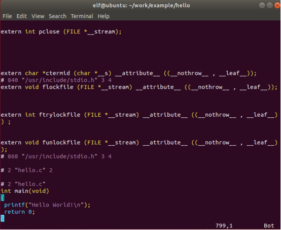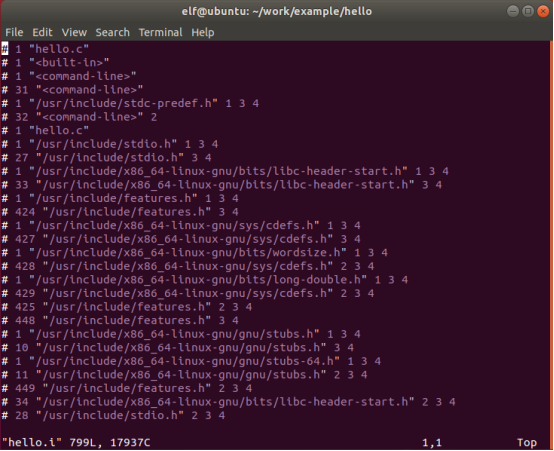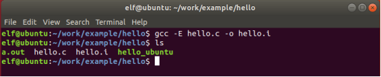 | elf@ubuntu:~/work/example/hello$ gcc -E hello.c -o hello.i |