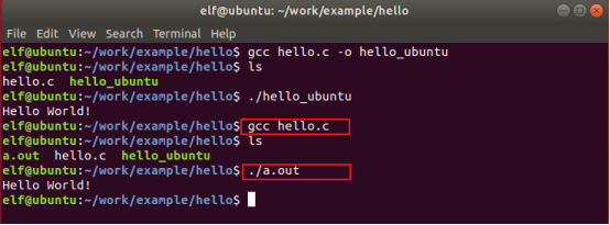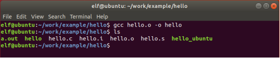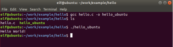 | elf@ubuntu:~/work/example/hello$ gcc hello.c -o hello_ubuntu |