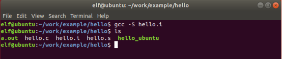 | elf@ubuntu:~/work/example/hello$ gcc -S hello.i |