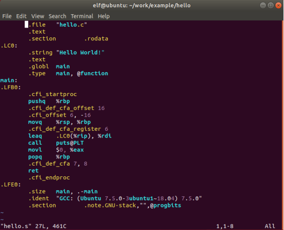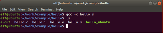 | elf@ubuntu:~/work/example/hello$ gcc -c hello.s |