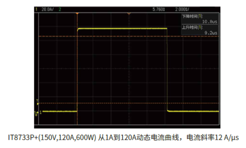 1.电流变化率:指电子负载改变电流时的速度,单位通常是A/μs。这个值越大,意味着电流爬升或下降的“斜率”越陡峭。目前6Kw150V的低压电子负载产品中较高的电流爬升率已经可以达到40A/us。
