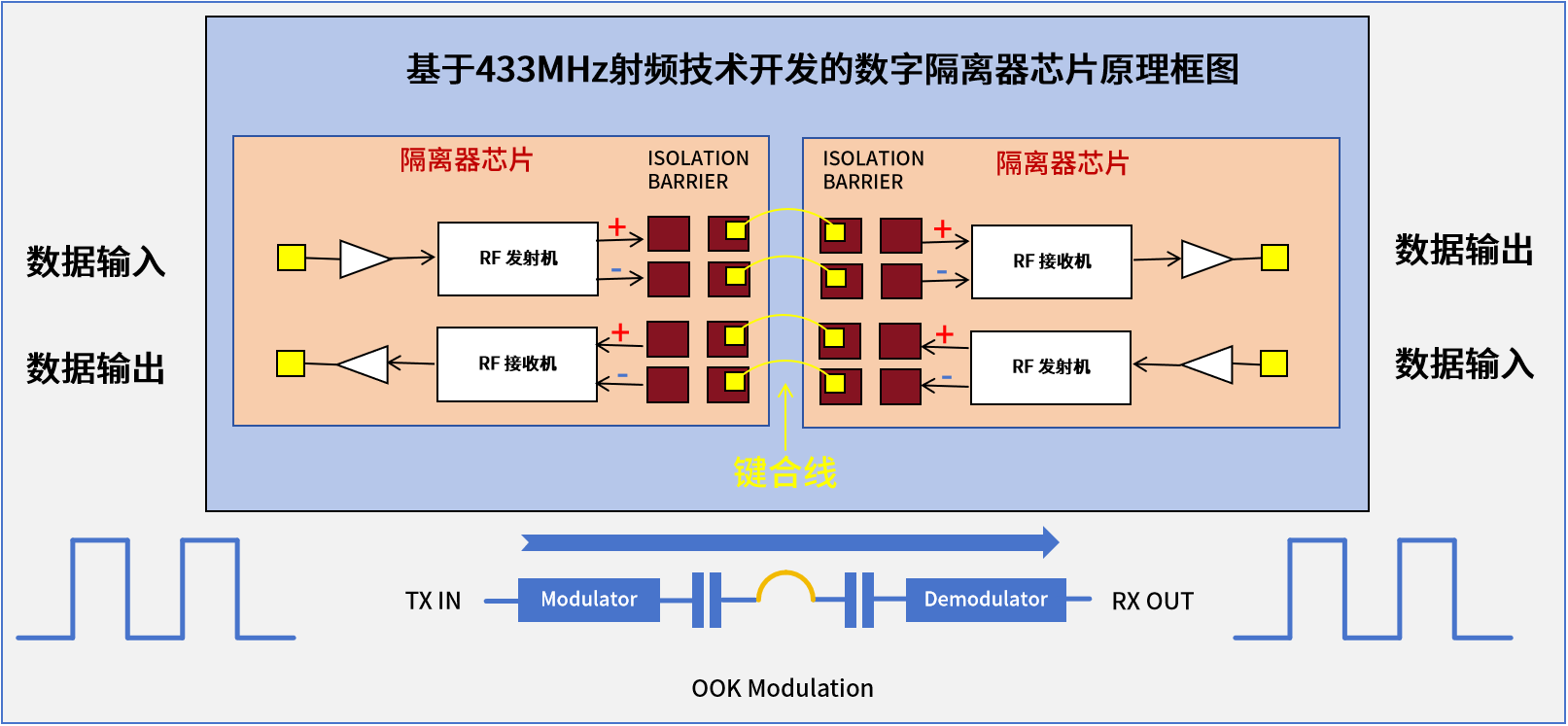 例如,华普微基于433MHz射频技术自主开发的数字隔离器就是一种可有效提升高压电气系统稳定性与安全性的国产化替代芯片,其工作原理为通过OOK调制技术将逻辑侧输入的数字信号调制为高频脉冲信号(使其具备交流特性),而后通过电容电场耦合传输至信号接收端,信号接收端再将其解调输出为原来的数字信号,从而在电气隔离的条件下实现信号的稳定传输。