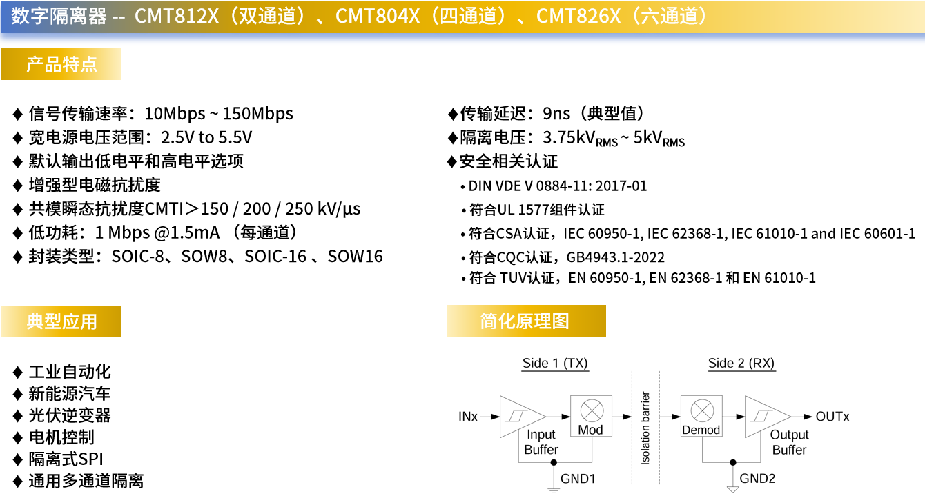 如上图所示,CMT812X(2通道)、CMT804X(4通道)与CMT826X(6通道)系列标准容耦隔离器采用的是稳健可靠的二氧化硅(SiO2)绝缘栅,不仅支持高达5 kVRms隔离电压、8kV浪涌能力以及40年以上的预期使用寿命,还可显著增强器件电磁兼容性(EMC),有效满足系统级ESD、EFT、浪涌和辐射方面的合规要求。