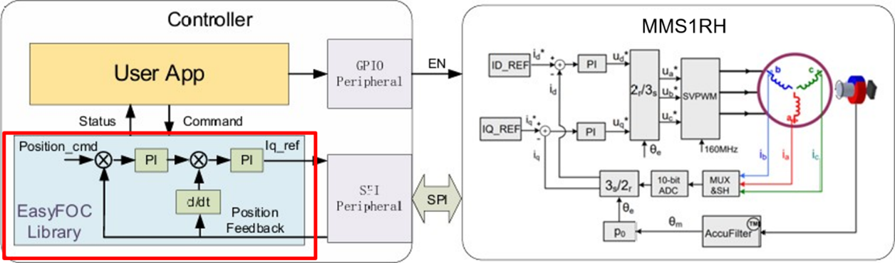 EasyFOC库可通过 SPI 接口读取电机的角度、电流、电压反馈,并根据客户给定的控制模式计算对应指令,发送至 MMS1RH 以实现位置或速度闭环控制;其中,对实时性要求较高的 FOC 电流环部分,直接在 MMS1RH内部完成。