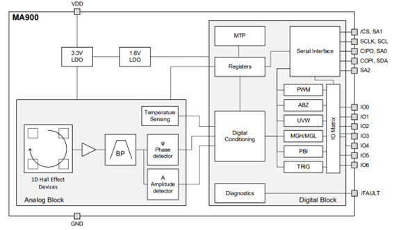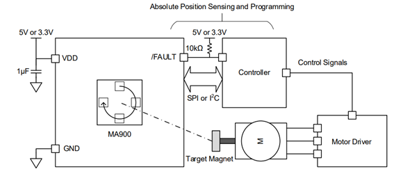MA900提供两种供电电压,3V至3.6V和4.5V至5V。通信接口支持SPI、I?C、ABZ、PWM、UVW、SSI、SENT,可适配多种电压与通信协议场景。在故障检测方面,MA900还可配置磁场强度检测,便于诊断检查。