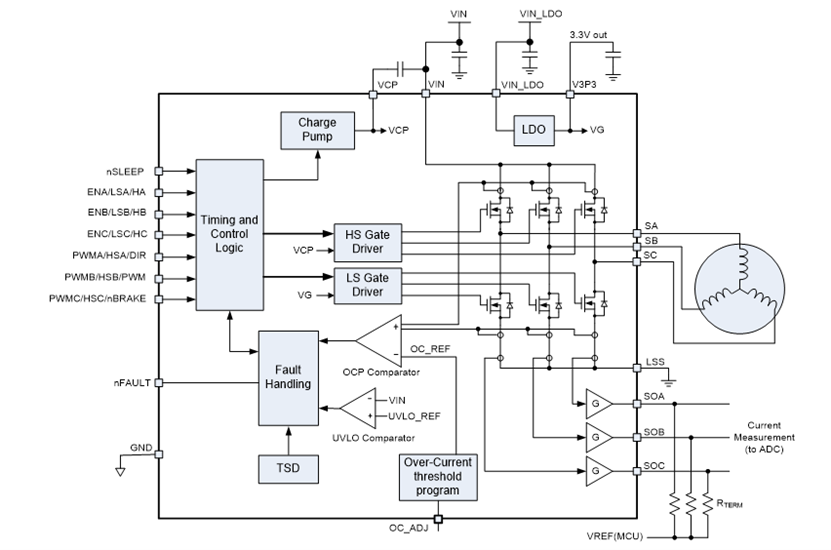 | 过流保护(OCP) | 实时监测相电流,阈值可调 | 防止电机堵转烧毁 |