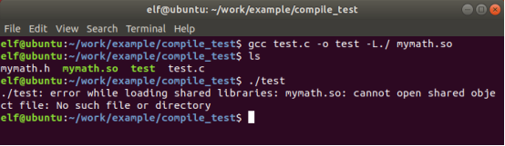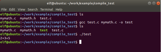 然后进行编译,因为test引用了mymath.h,所以不能单独编译,gcc test.c mymath.c一起进行,否则就会报错。(如下编译正确)