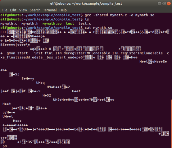 接下来是生成动态链接库的方法,gcc -shared xx -o xxx.so,当我们使用cat去进行查看的时候会发现,so文件里全是乱码,这就是使用动态链接库的一个好处,可以防止核心算法的泄露。