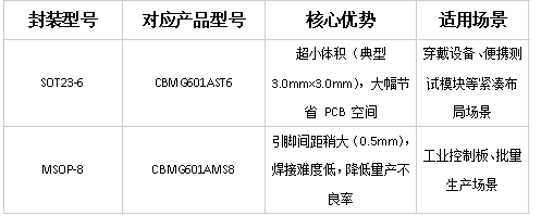 CBMG601 提供两种小型化封装,电气性能完全一致,选型仅需参考 PCB 空间与焊接工艺: