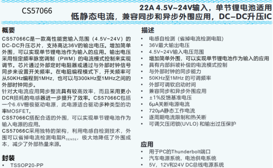 音响供电无非就是直流电或者交流电。这边默认直流电,而选择直流的大多数场景都是需要升压的,所以我介绍一款比较通用的升压,比较宽的电压范围可以升压到最高36V,适合功率150W以内的场景使用。CS57066:22A 4.5V~24V 输入,单节锂电池适用,低静态电流,兼容同步和异步外围应用,DC-DC 升压 IC。