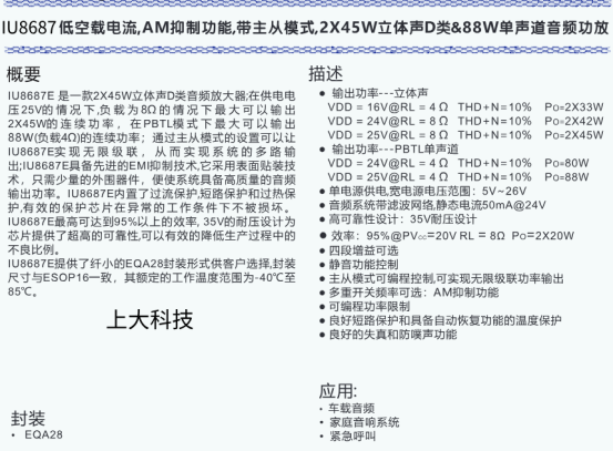 IU8687在输入25V的情况下选择8Ω的喇叭就能做到THD+N=10%输出双声道2 X 45W或者选择4欧姆单声道88W。在功率不足够的情况下就可以选择另一颗IU8689。