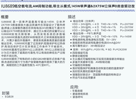 IU8689在输入24V的情况下选择4Ω的喇叭就能做到THD+N=10%输出双声道2 X 75W或者输入28V选用3Ω的喇叭做到单声道145W。