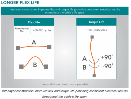 DPL还为整体可靠性带来了其他改进。DPL层包裹螺旋箔屏蔽层,提高了其弯曲时的强度。它在脆弱的箔层和围绕它的编织网之间提供了一个界面,降低了导电氧化的风险。结果是电缆具有更高的弯曲循环寿命和改进提升的耐用性。