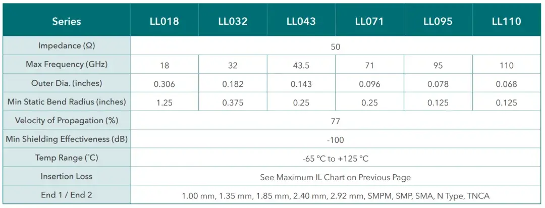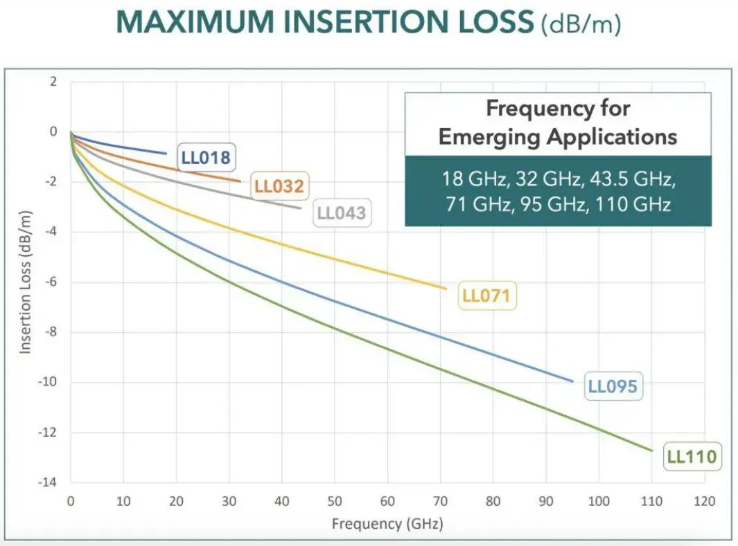 然而,Nitrowave?的关键特性之一是它不是单一产品。相反,它是一个电缆家族,每个电缆都针对从18 GHz 到最高110 GHz的不同频率进行了优化。这些频率是在对客户需求进行广泛研究后精心选择的,Nitrowave?电缆家族针对一系列频率进行了优化,每根电缆都旨在在其自身的频率范围内提供尽可能最佳的插入损耗。