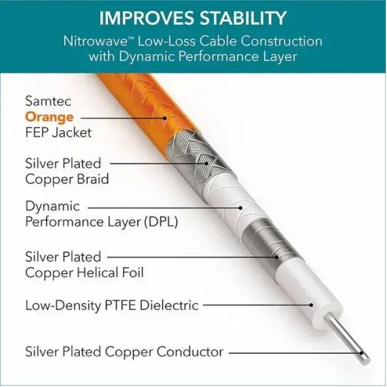 Nitrowave?电缆的箔层和编织网均使用镀银铜作为材料,并带有Samtec标志性橙色的?FEP(氟化乙烯丙烯)护套,以在一些最严苛的条件下提供保护。FEP护套专为航空航天以及仪器仪表和计算行业的严苛应用而设计,具有高工作温度和耐磨性。