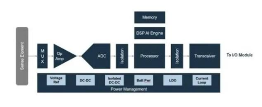 在典型的工业传感器中,主要组件(见图 1)包括传感元件、电压基准源、运算放大器 (OpAmp)、模数转换器 (ADC)、处理器、接口和电源管理模块。传感元件负责测量物理参数,并将其转化为电压、电流、电阻等电信号。