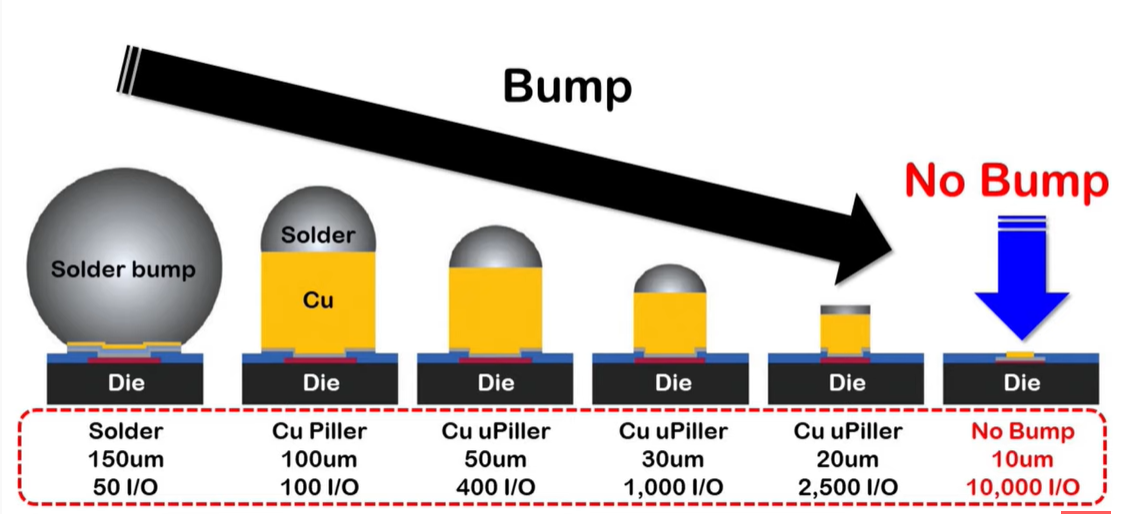 支持不同工艺节点/功能的芯片(逻辑、高带宽内存、模拟/RF、传感器)以超高密度(互连节距<1μm)、低延迟、高带宽集成。
