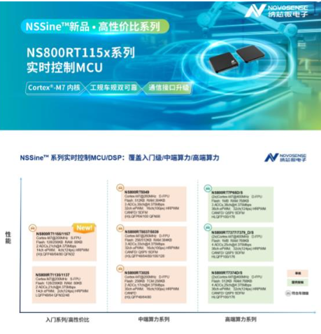 纳芯微正式推出 NS800RT115x 系列高性价比 MCU,基于 Arm? Cortex?-M7 内核,主频高达 200 MHz,搭载自研 mMATH 数学加速核,集成高速 ADC、精细 PWM、CAN FD、增量式编码器接口以及功能安全模块,可高效处理三角函数、反三角函数、开方、滤波等数学运算,大幅提升实时运算效率,可广泛应用于车身电子与照明、电机驱动器、数字电源等领域,提供符合 ISO 26262 ASIL-B 与 AEC-Q100 Grade 1 标准的型号,为汽车与工业控制应用提供高性能与高可靠的解决方案。