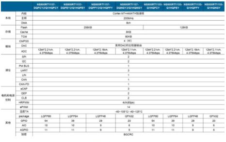 此外,NS800RT115x 系列提供 LQFP80/64/48、QFN32等多种封装,满足从高性能控制单元到紧凑型模块的不同设计需求。