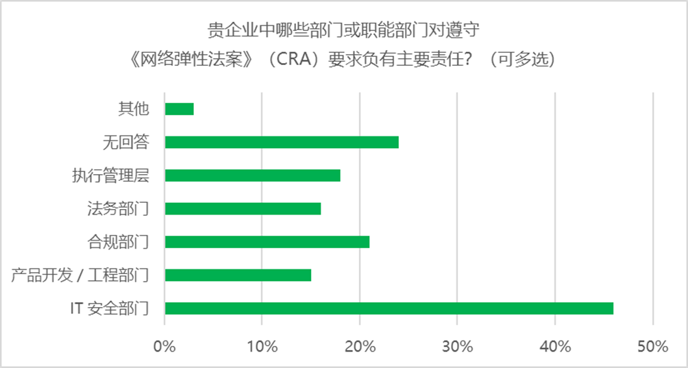 当被问及由谁负责确保符合《网络韧性法案》要求时,各企业的回答呈现显著差异。调查数据显示:46%的企业由IT安全部门主导合规工作;21%由合规部门牵头;16%由法务部门负责。另有18%企业的最高管理层直接主抓此事,15%企业则将职责赋予产品开发部门。由此可见,在大多数情况下,企业很可能通过多部门协同的方式承担CRA合规责任。