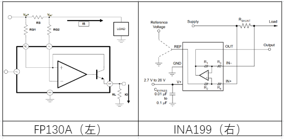图3: FP130A(左)与INA199(右)典型用于电路图对比