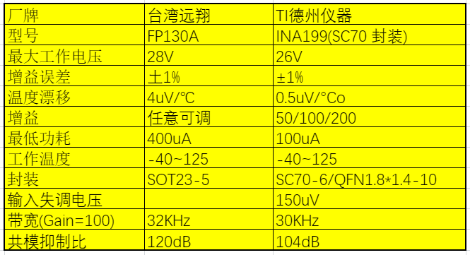 1、FP130A的共模输入动态范围要比INA199的要宽,所以FP130A的电流放大的能力要比INA199强。