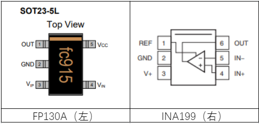 图2: FP130A(左)与INA199(右)封装管脚顺序对比