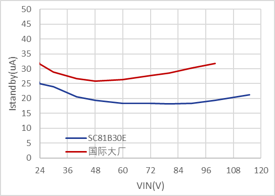 对于高电压场景,即使较低的静态电流也能造成较大的功率损耗。尤其对于电池供电类设备,低功耗可大大降低电池自放电损耗,延长电池产品使用时间。新产品采用低功耗设计,将芯片的静态电流降低至10uA,可有效降低DCDC在轻载时的待机损耗,提高轻载效率。此外,SC81XXE系列产品提供EXT引脚用于芯片供电,通过将EXT脚连接至输出端或外部5~12V电源可进一步提高轻载能效。