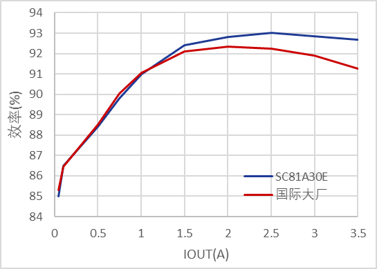 SC81A30的MOSEFT导通电阻仅有竞品的40%,同条件下实测温升低15.2℃。