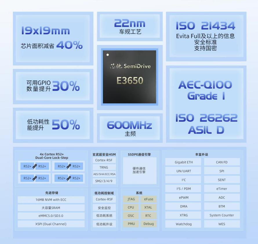 全场景智能车芯引领者芯驰科技宣布,其E3系列MCU旗舰产品 E3650 已正式进入规模化量产,完成 AEC-Q100 Grade 1可靠性认证,将面向客户接受量产订单。