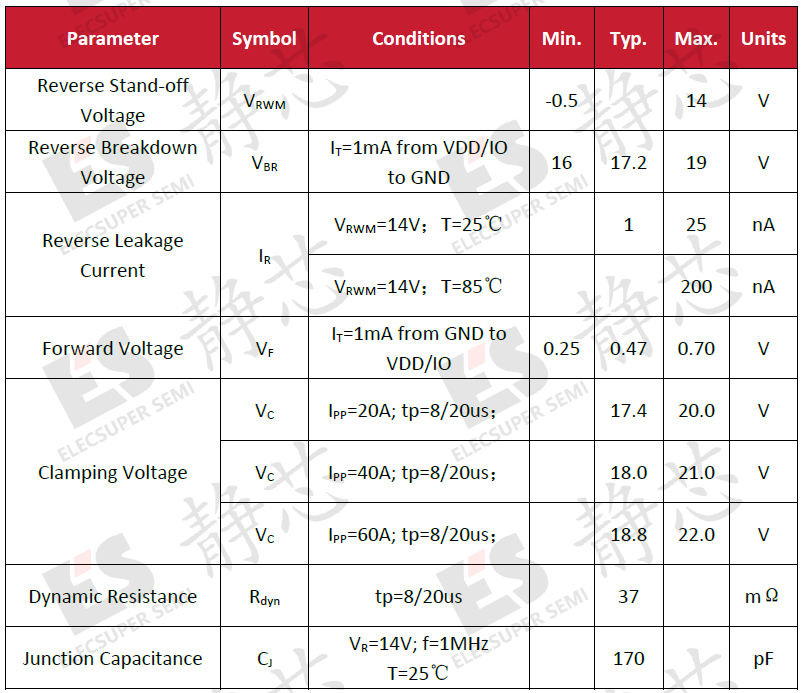 ESTVS1400DRVR是湖南静芯新推出的TDS平缓浪涌抑制器,均符合IEC 61000-4-2 (ESD) 规范,在 ±30kV(空气)和 ±30kV(接触)下提供瞬变保护,采用小型 DFN 2mm x 2mm x 0.68mm 6引脚封装。其中ESTVS1400DRVR通常用于保护工作电压为12V、14V的系统,器件的触发电压典型值为17.2V,额定瞬态峰值脉冲电流可达60A(tp=8/20μs),钳位电压VC为20V以内。