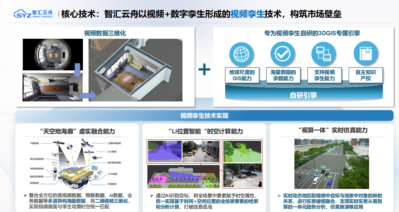 这些因素导致传统数字孪生难以实时反映现实场景的变化,大大限制了其应用范围和效果。为了解决这些问题,智汇云舟提出了"视频孪生,即视频+数字孪生"的概念,是对数字孪生的创新升级,这可以视为初步的"活孪生"。视频孪生旨在实时反映现实场景的变化,是对传统数字孪生的重要补充。