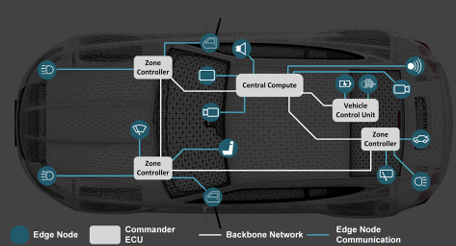 图 1. 包括命令器 ECU 和多个边缘节点的汽车区域架构